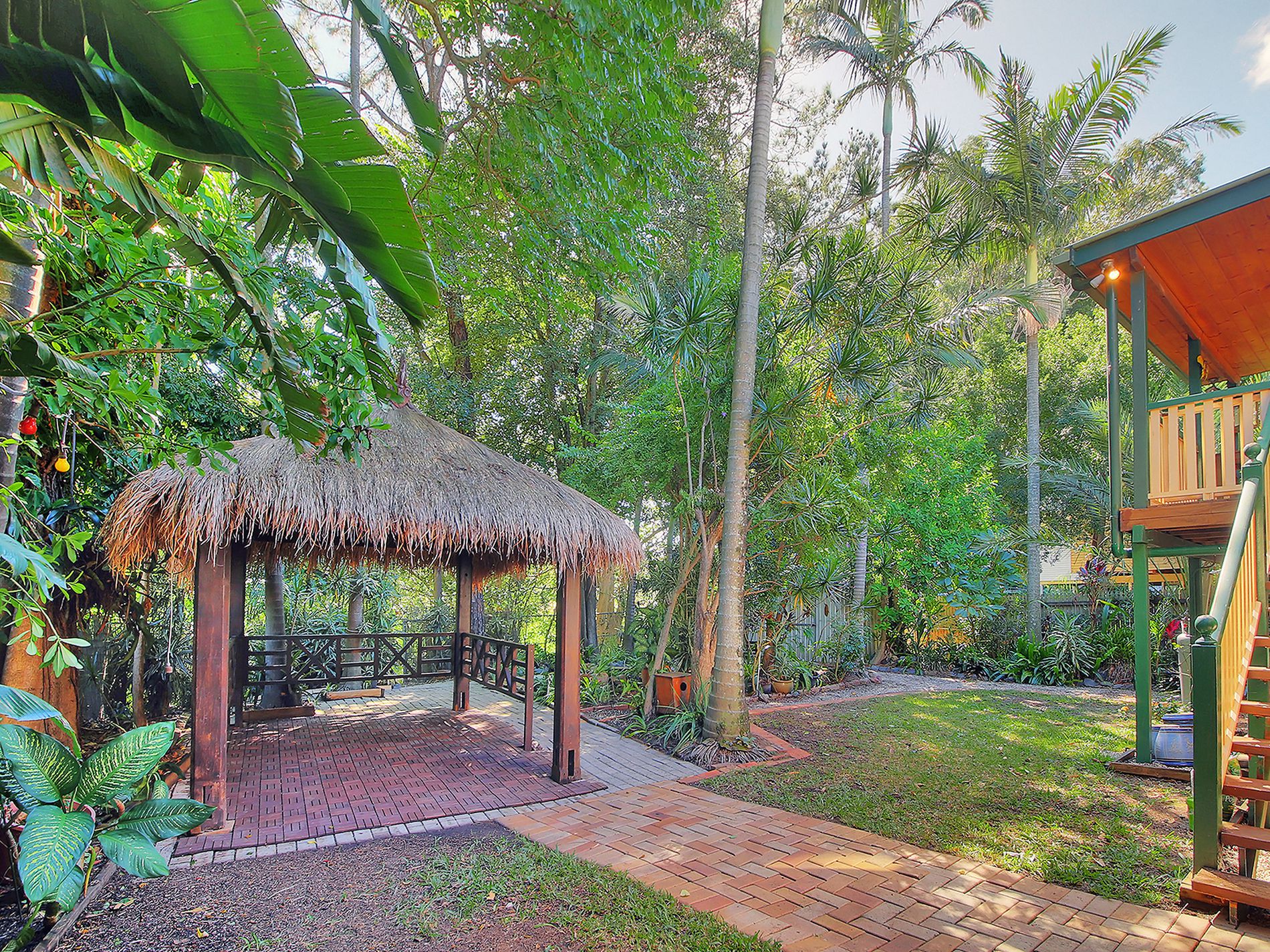 From the paved back patio, the backyard opens up, allowing green thumbs to let their imagination run wild with an ambling yard filled with beautiful gardens acting as a sanctuary away from bustling reality. It's also the perfect place for children to play and dream up new worlds, with nooks and crannies providing endless hours of fun. There is yet more entertaining space to relish here too with a paved path leading to a large deck and Tiki hut, great for late-night drinks, chats over a winter fire or wining and dining in a tropical setting.