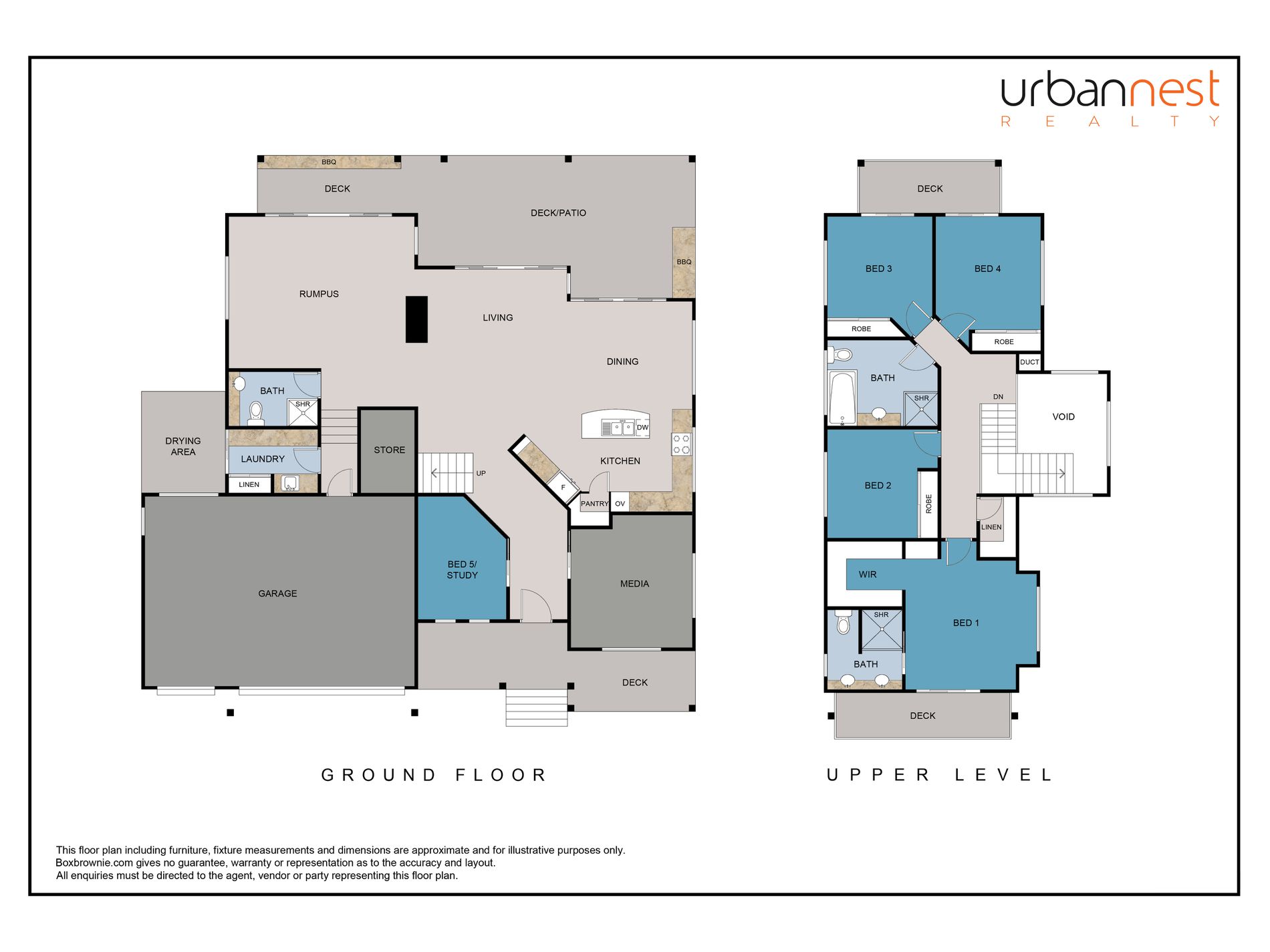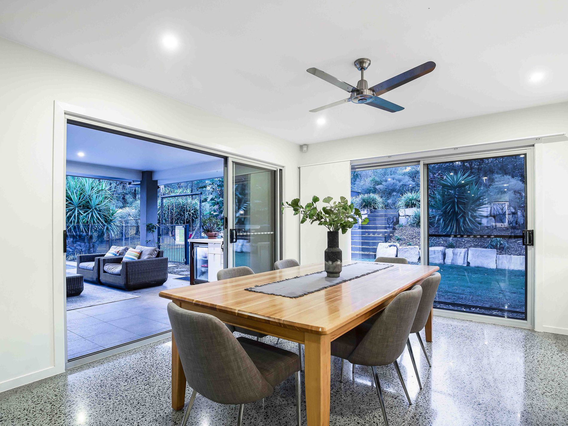 As you enter the home via the beautiful entry timber deck you are greeted with gleaming polished concrete foyer and glimpses through to the double-height void with clearlite louvre windows. The house features 4 full-size bedrooms plus a 5th bedroom providing built-in joinery and easy access to the entry for any professional working from home.